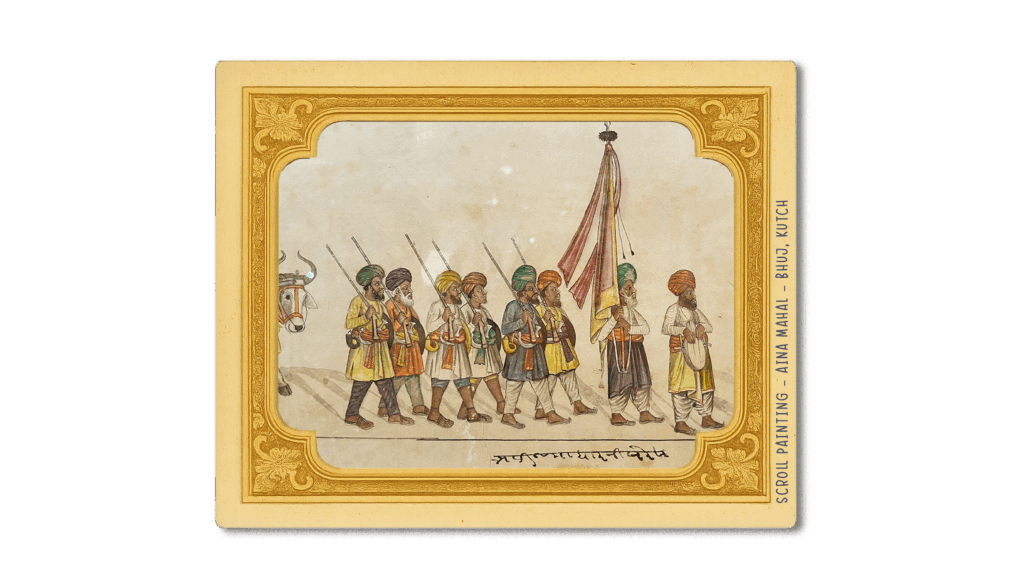 Historically, the Kamangars whose name the art later inherited were not painters by training. They were skilled artisans known for decorating bows, shields, and ceremonial arms for the royal courts of Kutch. Over time, they extended their artistry to the walls of Jain traders, Bhatia patrons, and even royal estates. Their paintings traveled beyond walls, too onto scrolls commissioned for palace halls.